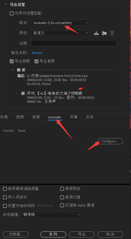 在软件输出的格式里选择 Voukoder,然后在选项里再点击,即可打开Voukoder操作界面