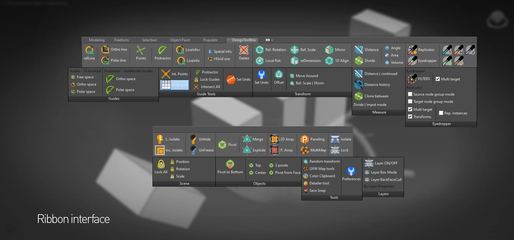Design Toolbox is a collection of tools specially designed to accelerate and simplify basic modeling tasks for architectural models, furniture design and other tasks where accurate modeling is needed.Professionals used to CAD or precision software will find it very familiar some of the included transformation tools, like reference rotation, scale and position, measurement tools and reference guides.