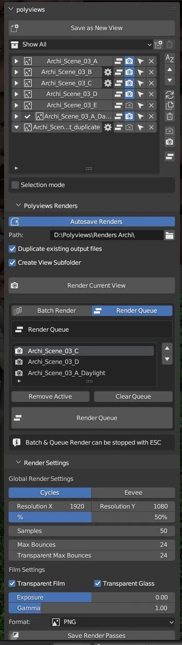 Polyviews是一个简单而强大的视图管理器,可以在一个.blend文件中渲染多个视图。它会保存所选摄像机视图及其世界和集合状态。您可以为所选视图添加自定义渲染设置,例如分辨率或采样,并最终通过一键点击进行全部渲染,并在选择的目录中自动保存。