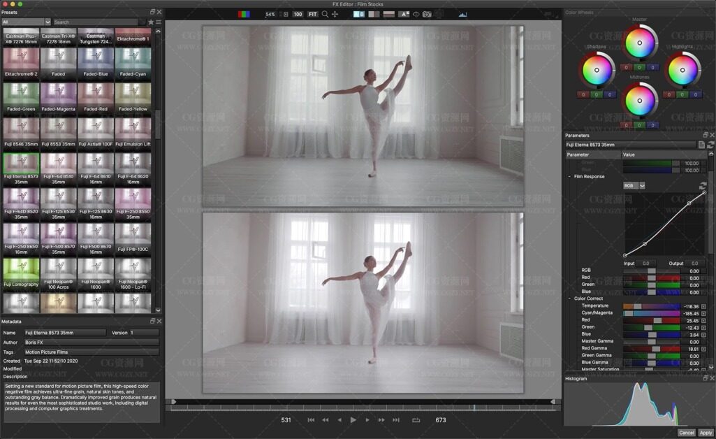 新的FX编辑器内置于已添加到Continuum 2021中的80个新的,符合HDR要求的BCC +过滤器中的每一个中。这种全新的预设编辑器提供了一种可视化的方式来与4000多种工厂安装的和自定义生成的预设进行交互,并包括交互式色彩曲线编辑器,交互式三向色轮,可视直方图,带分割和并排的快照比较模式侧视图和OCIO颜色LUT选项。