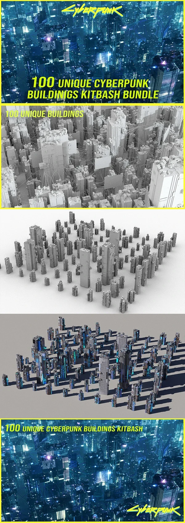 3D模型|100个赛博朋克科幻城市建筑3D模型-Cgtrader – 100 Unique Cyberpunk Sci fi City Buildings 3D Model