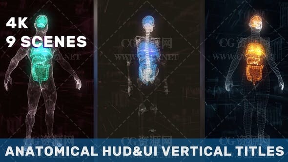 科技医疗人体解剖器官文字标题3D展示动画模板下载 Anatomical Vertical HUD UI Titles