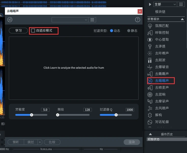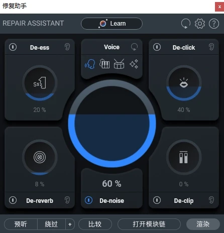 1.全新的修复助手:智能的识别噪音等其他问题,只需要点击学习learn插件自动识别你的音频素材,可以自动分析并自适应处理咝咝声、混响、人声、噪音等音频问题,并可以一键控制处理。