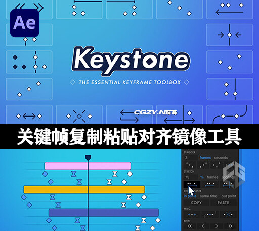 Keystone 3是一款AE扩展脚本,可以对关键帧复制粘贴对齐镜像拉伸调节控制。脚本可以让多个关键帧对齐、翻转、错开、复制、拉伸等等!在After Effects直接使用关键帧,操作它们可能很乏味。借助Keystone脚本基于图标的界面,现在只需点击一下即可完成。