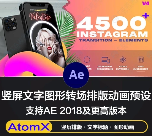 包含302组竖屏文字图片排版动画+2554组转场(图形+无缝+信号损坏+水墨笔刷+图形遮罩等)+81组背景动画+263组文字标题字幕动画+412组图标图形动画+129组字母动画+20组相机UI界面动画,通过AtomX脚本来生成调用,效果可视化,需要什么效果直接生成即可,使用十分简单,文字、图片、字体、颜色等基本参数都可以修改。