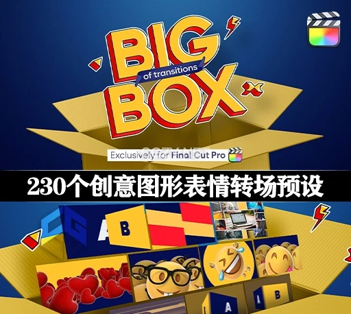 中英双语-FCPX插件|230种创意图形表情3D翻转移动缩放故障闪光转场预设 Big Box of Transitions