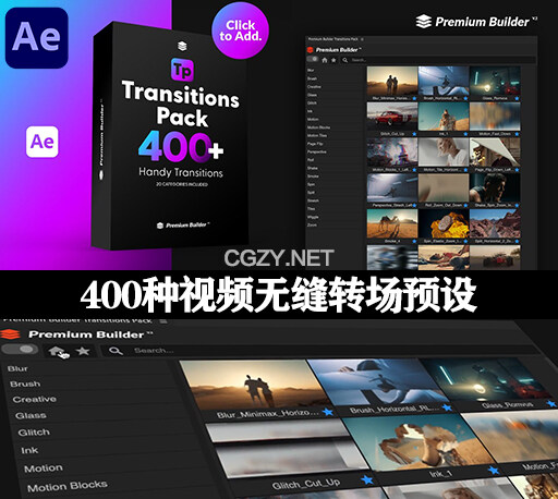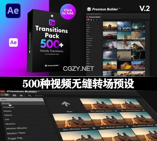超过500组无缝视频转场如:摄像机聚焦、扭曲旋转、模糊、图形遮罩、水墨笔刷遮罩、抖动等转场效果。包含AE模板工程和脚本形式,可视化,需要什么效果点击生成即可,要求AE CC 2019或者更高版本