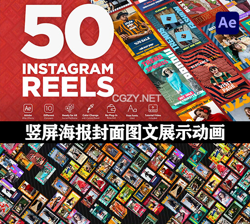 这款After Effects 模板包含50个竖屏封面介绍展示动画,可替换视频或者图标,可以自定义:颜色,文字等,10种类型。