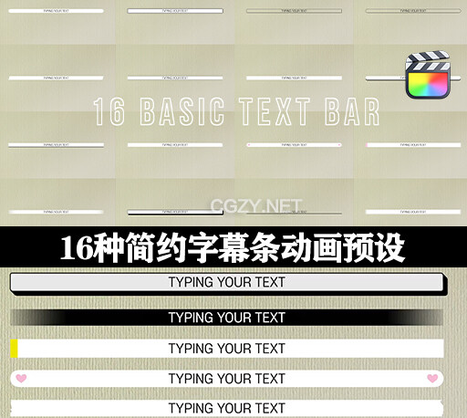 Text Bar是一款适用于苹果的Final Cut Pro X软件的插件,提供了16种简约的字幕条动画预设。这些预设可以用于创建各种类型的标题、字幕、下方的字幕以及其他文本效果。