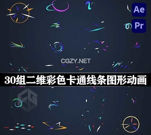 包含30组彩色二维抽象运动元素的AE/PR模板。每组动画都包含多个彩色线条和形状,适合用于电视节目、广告、演示文稿、社交媒体等多种场合。