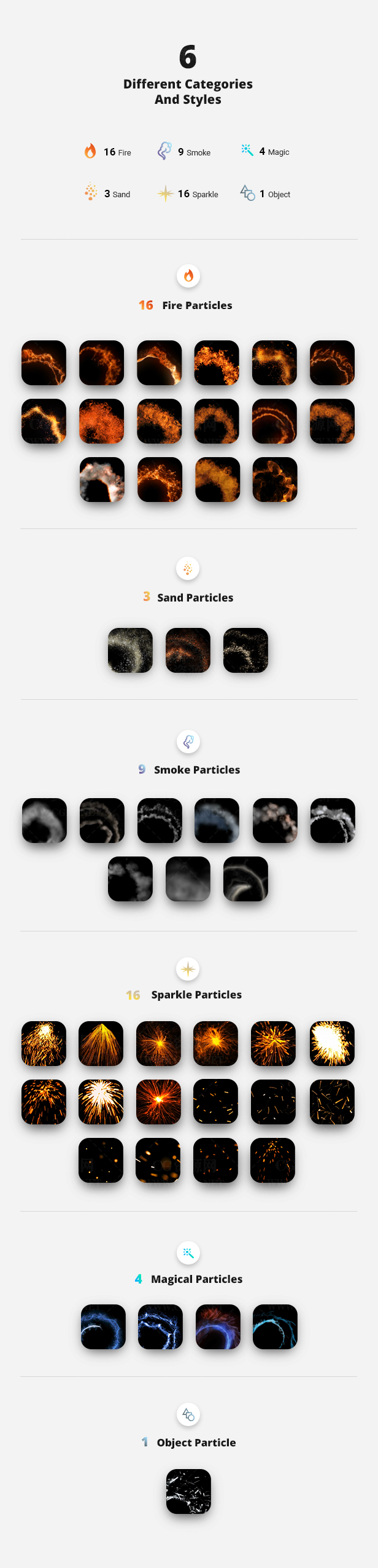 【6 个粒子特效类别】 包含 16 个火焰、8 个烟雾、4 个魔幻、3 个沙尘、16 个火花、1 个对象;