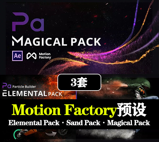 AE脚本|3套Motion Factory预设包|火焰烟雾魔法火星尘土粒子飘散破碎消失特效工具包