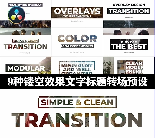 包括9个叠加镂空效果标题转场过渡,只需将它拖放到您的视频中,编辑文本,编辑颜色即可做出效果。