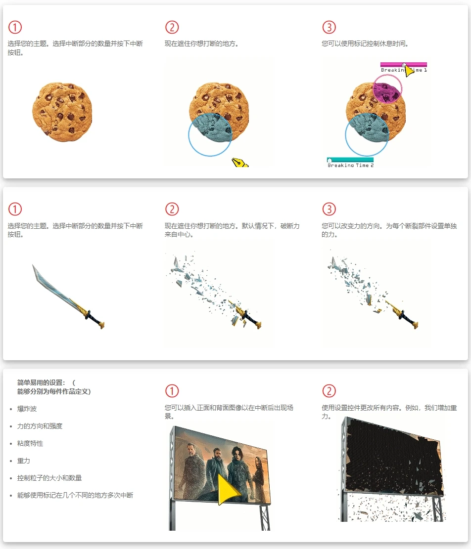 - 只需单击几下,即可从您的对象创建漂亮的中断效果。