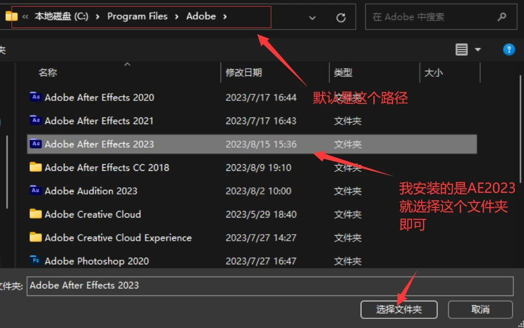 5.点击Path选择软件安装路径:如:C:\Program Files\Adobe\Adobe After Effects 2023
