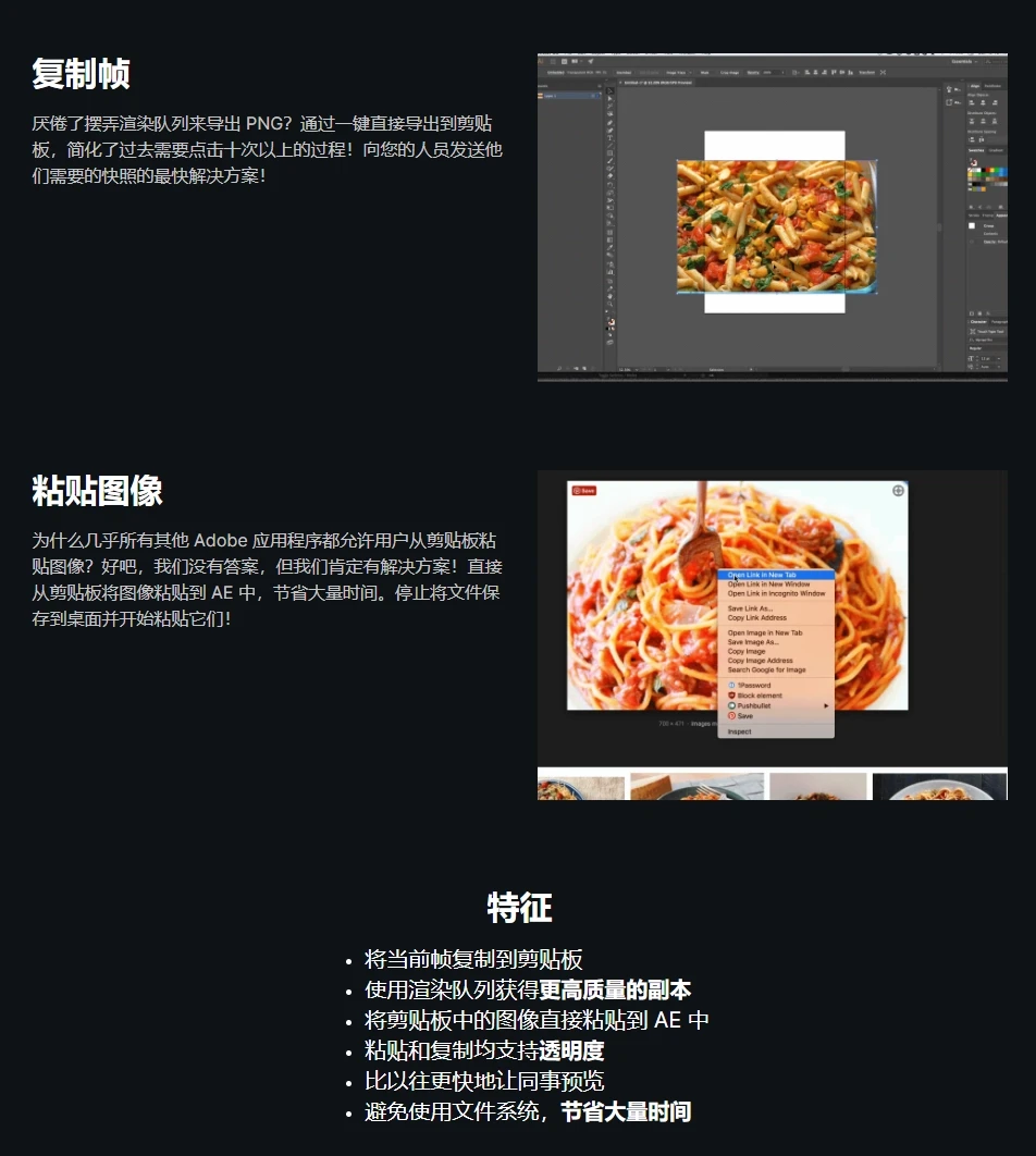 Copy Pasta是一个用于Adobe After Effects的脚本,它提供了简单而高效的复制和粘贴图像的功能。可以让AE和其他软件间复制粘贴图形图片,舍去了麻烦的导入导出,节约时间,提高效率。