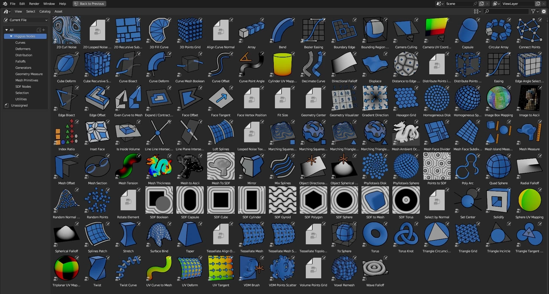 Higgsas包含超过140组节点预设,包括模型扭曲变形效果器、各种生成器、曲线控制、测量、模型分布、衰减等,以帮助改善和增强程序化工作流程。