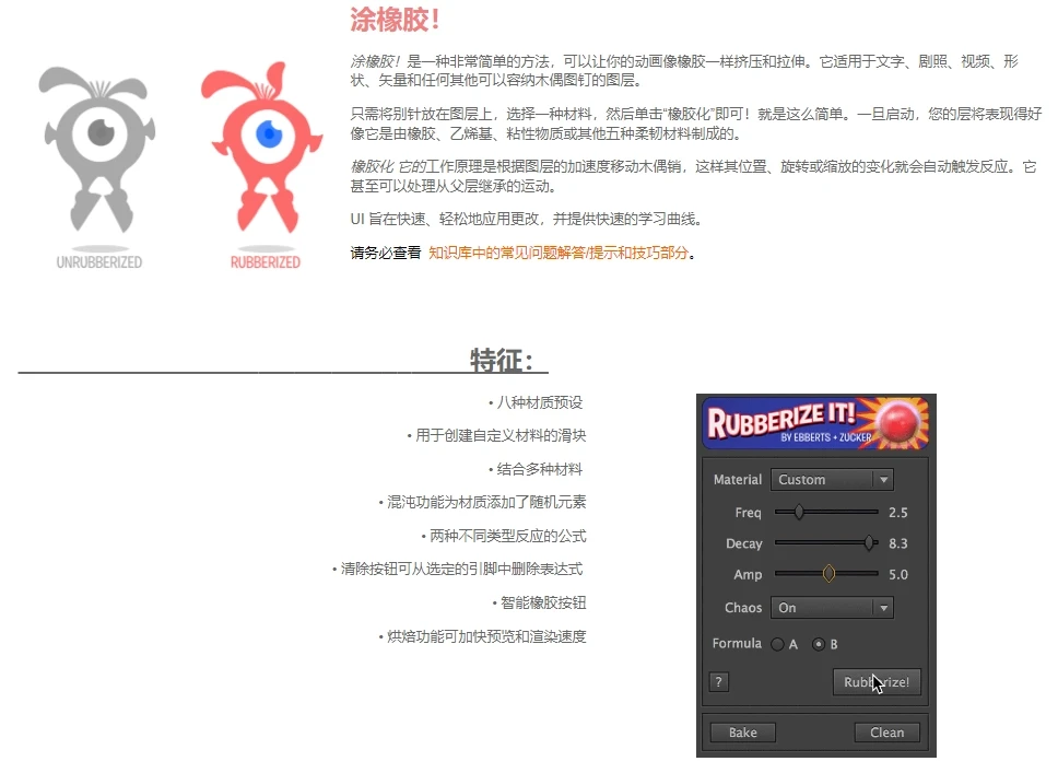 Rubberize It!是Adobe After Effects一个制作弹簧效果工具。它为用户提供了一种简单的方式来为动画图层添加橡胶效果的功能。给物体打上图钉之后,可以模拟弹簧效果预设,设置振幅频率等多种参数。