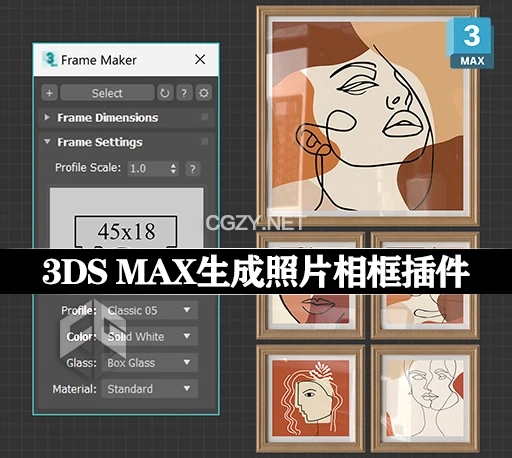 Frame Maker是一个用于3DS MAX的插件。它为用户提供了一个快速创建图片框架的工具,能够根据导入的图片文件自动调整正确的比例。该插件可以一次性创建多个图片框架,提供了多种选项,包括尺寸、框架样式、颜色和玻璃材质等。
