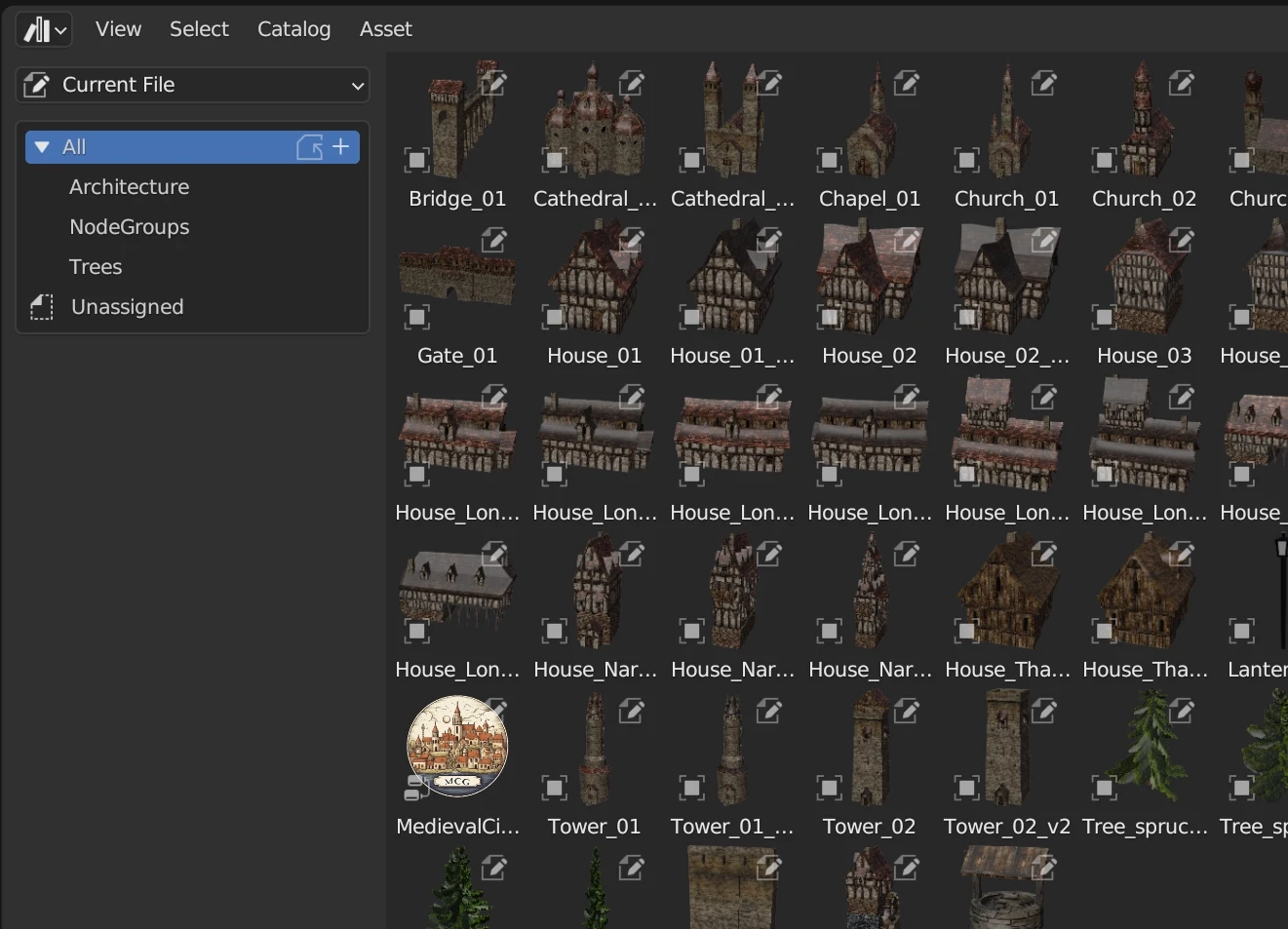可用于创建中世纪风格的城市场景,使用Geometry Nodes设置,不会占用很大系统资源就可以将曲线轻松转换为可调整的城市街区,同时具备绘制城市布局。