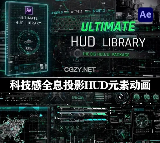 未来感图形HUD元素,技术显示UI界面、图标、加载器、地图等全息投影素材。适合用于未来感电影、视频、游戏、演示等。