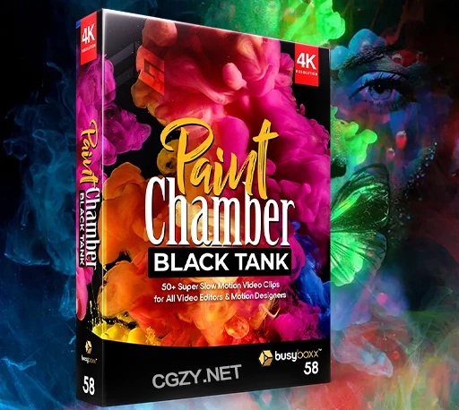 BusyBoxx V58 Paint Chamber Black包含54组黑色背景水彩流动视频素材。素材没有透明通道,4K分辨率,可修改混合模式(屏幕/滤色)即可与你的视频素材叠加使用。适用于VFX特效合成、画面叠加或背景中使用。