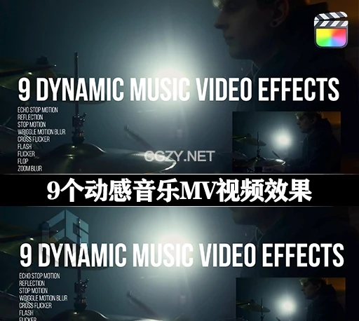 这是一套免费的FCPX插件,包含9种动态音乐视频效果,如:抖动、模糊、定格动画、变焦缩放、光效反射棱镜等效果。