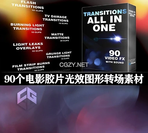 包含90种带有音效的转场过渡视频素材,7种类型:如光效素材、胶片燃烧素材、闪光素材、动感光素材、故障叠加素材等。