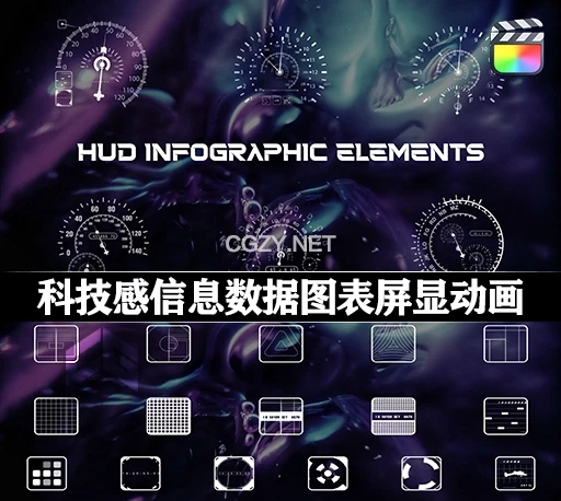 提供了一系列HUD(头上显示)风格的信息图形元素,可以用于制作高科技、未来感的视频内容。这些元素包括循环圆圈、立方体、信息面板和速度表等,可自定义颜色以适应您的项目需求。