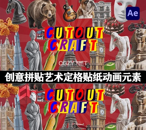 AE脚本+模板|2000+创意拼贴艺术建筑景点食物动物背景定格贴纸动画元素 Cutout Craft