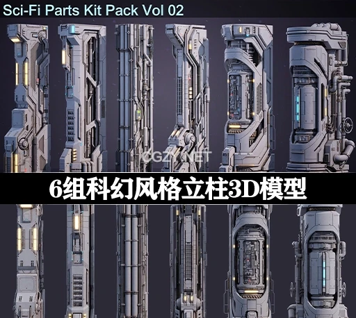 Sci-Fi Parts Kit Pack Vol 02 Column包含6组科幻风格立柱3D模型,3DS MAX/FBX/OBJ格式,包含贴图材质.