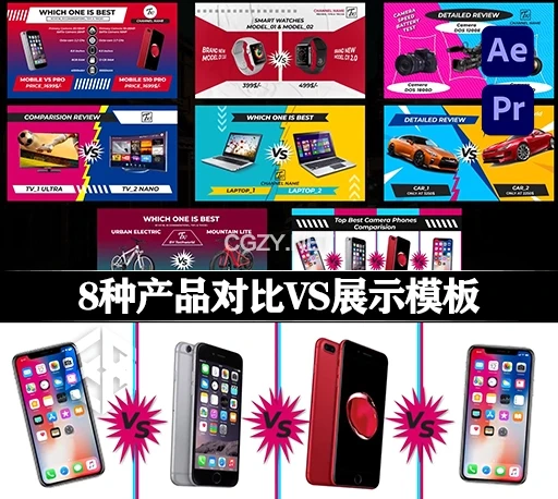 这是用于创建动态和专业的对比引导片头或视频过渡效果。包含8个预设样式和动画效果,适合用来制作产品比赛、对决或任何需要突显对比的场景。可以修改文本、颜色、占位符。