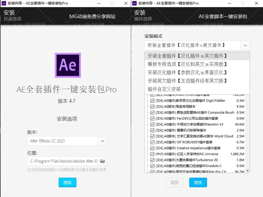 - 1.这是一个AE插件自动安装包合集,几乎包含市面所有AE插件,自动识别AE插件安装路径,一键安装AE插件。