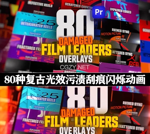 模板包含80种影片前导片头覆盖效果,分为20种独特的设计,每种设计有4个动画变体。它模拟了磨损、裂纹、撕裂和受损的电影胶片效果,非常适合为视频添加复古和受损的电影风格。