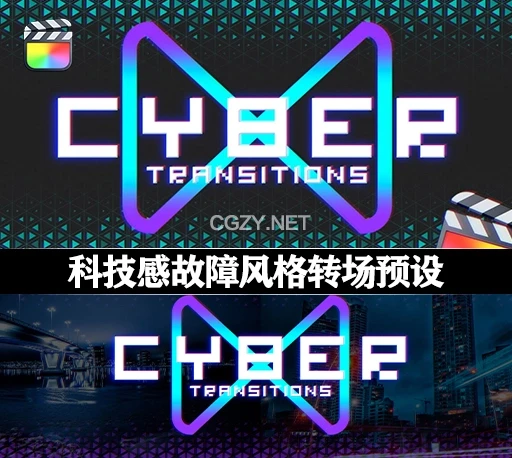 中英双语-FCPX插件|40种未来科技赛博朋克风格故障损坏干扰转场预设 Cyber Transitions