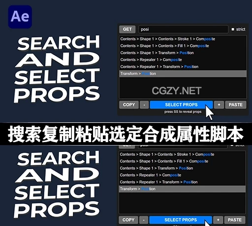 Search and Select Properties是一款提升工作效率的After Effects脚本,通过名称快速搜索合成中的特定属性,并提供“严格”模式以实现精确匹配。一旦找到所需属性,只需轻点按钮即可快速选择,同时支持复制和粘贴功能,极大地提升了工作效率。