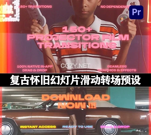 包含150种复古怀旧幻灯片滑动效果转场预设。将这些过渡直接拖放到他们的视频剪辑之间,创造模拟旧电影风格的幻灯片和滑动效果。