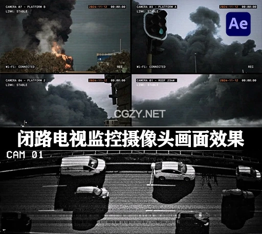 包含了8种独特的监控摄像头覆盖层样式,能够模拟各种闭路电视(CCTV)效果,从复古风格到现代风格,适用于需要真实监控画面效果。