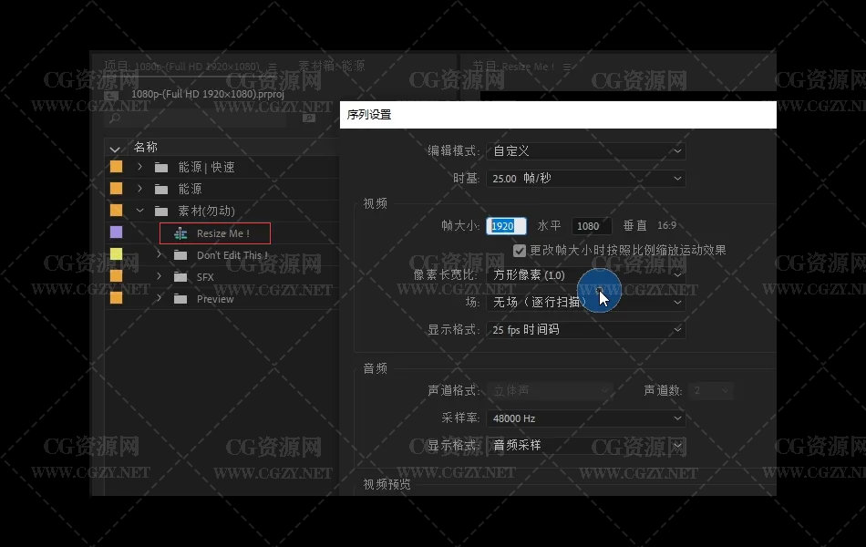 上方为根据视频序列尺寸,调整转场的尺寸,方法是双点打开素材勿动里的Resize Me !序列。在点击窗口处,序列设置,调整帧大小,根据我们的视频序列大小去调整大小,然后点击确定保存,即可。如果觉得麻烦也可以在文件夹里选择设置好的尺寸,支持720P-4320p,最高支持到8K。另外文件夹里还有一个覆盖效果预设包,分别是相机抖动效果,漏光效果,粒子效果,使用方法和转场一样。