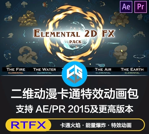 AE脚本+PR模板|二维动漫卡通烟雾火焰能量电流LOGO转场水花液体爆炸MG动画元素包(含视频素材) Elemental 2D FX pack