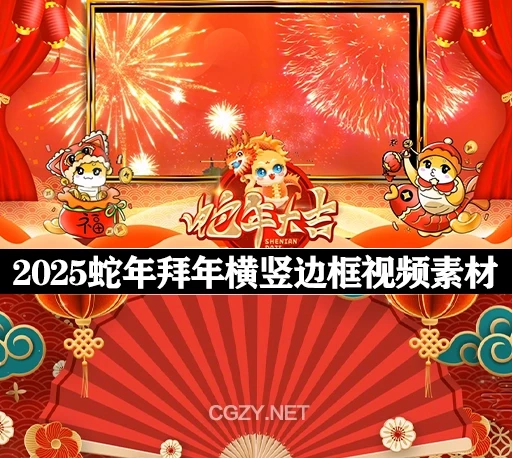 2025蛇年拜年横竖版边框MOV带Alpha通道绿幕免扣视频素材