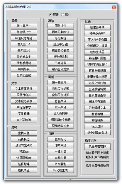 AI脚本插件合集2.0版,除了更新部分插件与增加几款新插件外,还支持AI CC 2019。此AI插件包现在有62款ai脚本插件,已经组合成插件面板的形式,方便在AI中调用,后续有新脚本也会陆续增加其中。脚本已经测试支持 illustrator AI CC 2019 64位版(win/mac)。