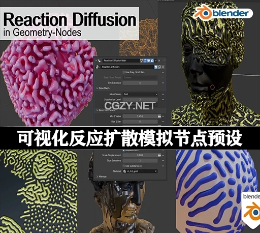 这个预设是基于反应扩散(Reaction Diffusion,简称RD)模拟的,利用Blender Geometry Nodes构建的。它能够创建出富有表现力和复杂的有机图案,非常适合用来制作抽象动画或模拟自然界中的物理现象,如动物皮毛的斑纹、细菌的互动生长等。