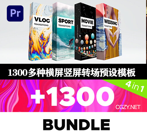 PR模板|1300多种横屏竖屏视频常用转场预设模板+音效