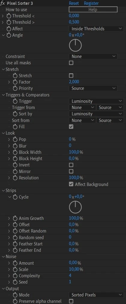 AE Pixel Sorter was the first tool to bring the pixel sorting glitch effect available for motion designers and video editors within After Effects. Experimenting with Pixel Sorting just became so much easier! Since its launch, AEPS had a huge success in Broadcast TV, Live performances, VJs, Music Videos, Video Games, Photography and even Apparel!