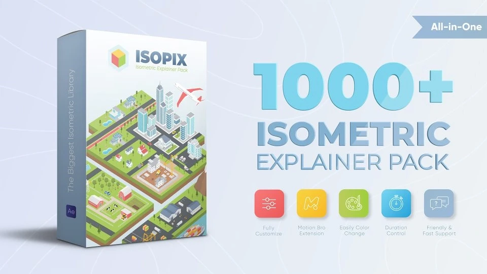 包含1000+扁平化等距风格元素动画,17种类型:如制作好的场景、建筑、人物、建通工具、信息数据图、图标ICON、道路、建筑元素、室内家具、地面、树木、文字标题、背景等多种分类,所有元素的颜色、文字、大小位置等基本参数都可以修改,通过Motion Bro 4来调用(已包含),可视化预览,使用十分方便。