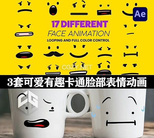 包含3套可爱卡通脸部表情动画,这些表情包你可以更改颜色放置在你的物体上。