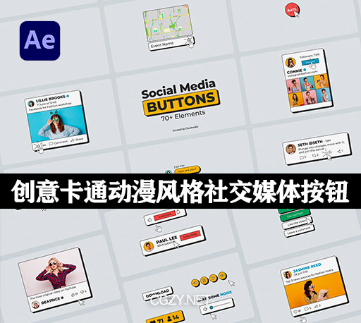AE模板|70组创意卡通动漫风格点赞关注评论聊天按钮元素动画 Social Media Buttons Pack