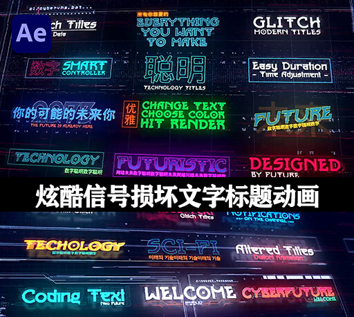 一键生成炫酷抖音文字动画!科技感能量信号干扰损坏文字标题动画AE模板下载