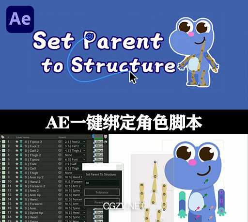 AE一键绑定角色脚本-Set Parent To Structure V0.3 自动绑定识别手脚,批量一键绑定角色